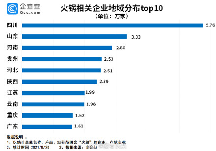 重要的日子吃火鍋,特殊的日子也要吃火鍋!火鍋,對四川人來說,是可以治愈選擇困難癥的存在企查查數據顯示,目前我國現存“火鍋”相關企業共41.86萬家。從企業省份分布來看,四川省以5.76萬家企業超過其他省份,其次是山東省、河南省。