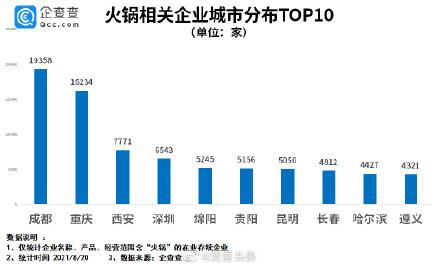 從城市分布來看,火鍋企業排名前三的城市是成都、重慶、西安,分別有企業1.94萬家、1.62萬家、0.78萬家。